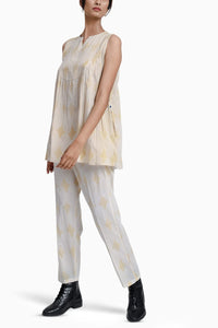 Block printed Cotton button yoke long flared tunic paired with soft finished cotton printed trousers with pockets. The tunic & trousers are minutely detailed with handwork in golden thread and signature handmade buttons.
