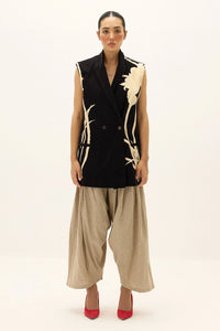 A structured corduroy sleeveless blazer reimagined with an artisanal touch. Featuring an abstract ivory print on a deep black base, is tailored with front buttons and long length for a contemporary edge.