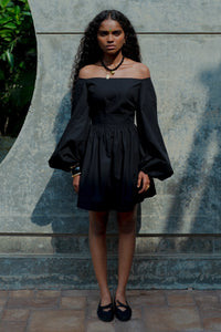 The Haze dress is a playful yet striking mini crafted in soft cotton. It features a flattering off-shoulder neckline with voluminous bishop sleeves and a fitted waist that flows into a gathered skirt. The back tie-up detail adds charm and adjustability, making it a standout for both daytime and evening looks.