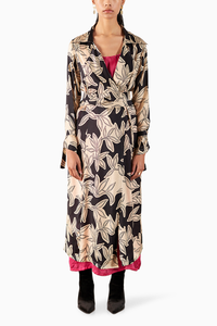 The Hazel Trench Coat with Contrast Slip Dress crafted from our stunning Vegan Silk fabrication, trans-seasonal, is a statement piece. Made in our hand drawn Hazel print inspired by the wild blooms of winter, it is a two piece set. With contrast striped strappy slip, it is chic. The trench, Featuring a straight fit, this piece is unlined and has belt details on the sleeves. It also has a belt on the waist. Wear it with heels for an elegant look.