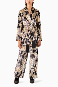 The Hazel Velvet Blazer & Pants Co-ord crafted from our stunning Viscose Velvet fabrication, trans-seasonal, is a statement piece. Made in our hand drawn Hazel print inspired by the wild blooms of winter, it has a straight fit. With a front button opening and lining, it is chic. Featuring a lapel and pockets, this piece is a classic and can be styled in different ways. Paired with our matching velvet Straight trousers. It also comes with a belt with fringes. Wear it with heels for an elegant look.