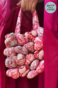 Heart Bag is designed using hand block printed cotton fabrics and features multiple handcrafted heart surface ornamentation. It also has a double strap for a comfortable holding and a titch-button for closure.