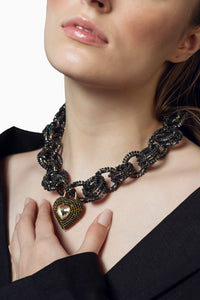 The Heart Lock Necklace is a meticulously handcrafted piece that features a fancy-cut heart crystal in a bezel setting. The padlock detail adds the chic factor to this elegant and extravagant piece with a charcoal black shade. It is convenient to use as it can simply be tied at the back with a ribbon, adjusting it to your comfort. Garnish your sparkle by wearing it to parties and grand celebrations!