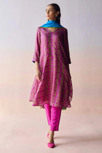 Handwoven in organza mulberry silk, the kurta features heart jamdani motifs that lend it a playful yet timeless charm. A v-neckline frames the silhouette with ease, while a silk modal slip ensures comfort throughout. Straight bright-pink pants complete the ensemble, balancing vibrance with simplicity.