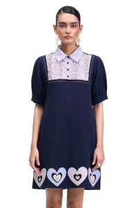 Crafted in Navy Banana Crepe, this embroidered short dress features intricate heart appliqué detailing and a flattering regular fit. The smooth texture and structured silhouette create a refined yet playful look suitable for both daytime and evening styling.