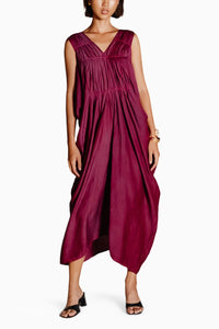 Featuring Heather Jumpsuit by Auruhfy from Advaya Collection. Adorning asymmetric hand-draped design with contrast stitch detailing. Complete with pleats on the front and back, and a convenient back zipper closure, it offers a breezy and stylish addition to your wardrobe.