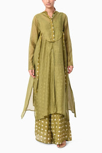 Elevate your everyday look with this effortlessly elegant set, featuring a solid V-neckline tunic paired with matching color-printed pants. A detachable, buttoned yoke adds dimension and versatility, revealing a beautifully block-printed back panel for a touch of artisanal flair. Modest, refined, and adaptable—perfect for any occasion.