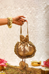 This helen brown potli embodies the maximalist spirit of luxury with its decadent bronze base and a decoration of myriads of gold motifs filled with ghungroos. It is peppy and playful while keeping the regal vibe intact.