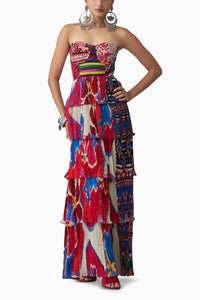 Featuring Helena Abstract Print Tiered Cocktail Dress with Pleat Detailing by Saaksha & Kinni, this luxurious dress showcases a quintuple abstract print in a tiered design, with hand micro pleat detailing. Crafted from a blend of Habutai, satin, cotton, silk, and chiffon for an elegant, multi-textured look.