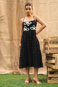 Introducing Helene a captivating midi dress crafted from luxurious black textured fabric. This fit-and-flare design beautifully hugs the body while offering a flattering silhouette. Adorned with exquisite hand-embroidered braided flower work on the bodice, Helene adds a touch of artistry and elegance. Featuring adjustable straps for a personalized fit, this dress is the perfect blend of sophistication and timeless charm.