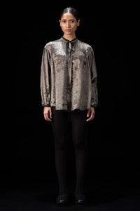 The Helix Silver Top is a striking and sophisticated garment crafted from luxurious tissue fabric. The delicate, lightweight texture of tissue gives the top an ethereal, graceful quality, while the shimmering silver color adds a modern, glamorous touch. The fabric’s subtle sheen enhances the top’s visual appeal, making it perfect for evening wear or special occasions.