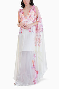 Featuring the Hey Dey Printed Long Kaftan with Plunging Neckline by Mandira Wirk's Waves of Love Collection. This stunning multi-ivory chiffon kaftan showcases a beautiful placement print, a frilled plunging neckline, and elegant pearl details, making it the perfect choice for a chic and sophisticated look.