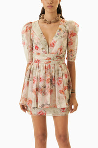 Hey there Delilah is a show-stopping mini dress that features a deep-v neckline and pleats on the bust, with a separate pleated panel at the waist. The dress has pretty puffed sleeves and is adorned with floral print all over it. It has a mini pencil underskirt with a sheer overlay gathered at the waist. The back has a delicate button fastening.