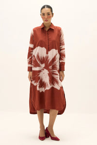 A relaxed shirt dress in handwoven cotton mul, featuring oversized hibiscus-inspired motifs in soft ivory against a terracotta base. Detailed with a classic collar, concealed placket, and curved hem, it offers a refined yet easy silhouette with subtle side slits for movement.
