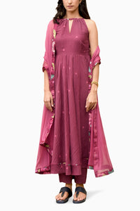 Featuring a kurta set in wine red color is tailored in mulmul fabric. Fitted at the bust and flared at the bottom, it has a keyhole neck with raglan-cut sleeves and pockets on both sides. It has a beautiful floral print all over and has a potli button closure at the back. It comes with matching cotton pants and a chiffon dupatta having a statement border to complete the set.