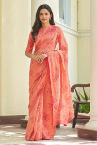 The Hibiscus Appliqué Saree, cast in a soft cheerful hue, features printed florals and delicate appliqué details that add texture and charm. Paired with a matching printed floral blouse for a graceful finish. This saree comes with an unstitched blouse piece.