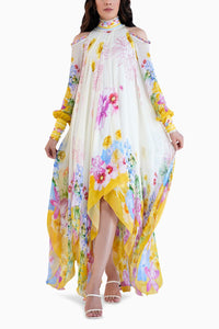 Featuring the High Low Dress with Frilled Shoulder Cutout by Mandira Wirk's Waves of Love Collection. This enchanting pastel mist printed chiffon dress features stylish shoulder cutouts, puff sleeves, and a hand-embroidered collar, making it a perfect choice for adding a touch of elegance to any occasion.