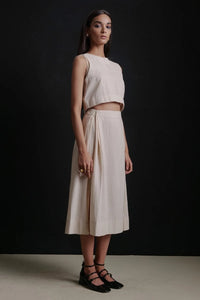 This stunning off-white corset set features a sleek sleeveless crop top with a structured corset fit, paired with a flowing side-flare skirt in a longer length. The refined design enhances the silhouette with a perfect balance of modern elegance and effortless grace, making it an ideal choice for any special occasion