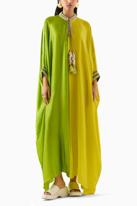 The High Tide Kimono crafted from our stunning vegan silk fabrication, trans-seasonal, is a statement piece. Made in our hand dyed ombre, this kaftan has an embroidered collar with a v-neckline. Featuring free size kimono sleeves, it has strings in the front with shell tassles. Half and half with a pleat in the front, this piece has embroidered cuffs and can be styled in different ways. It can be Paired with heels for a festive look.