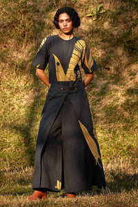 This jumpsuit in Khara Kapas’ signature khaki leaf print combines elegant design with modern sophistication. It features a front overlap panel, back zipper detailing, and front pleats for added refinement. The charcoal grey color offers a timeless, versatile appeal, while side seam pockets add practicality to the chic silhouette.