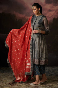 Featuring the Hina Rust Teal Kurta Set by Swatti Kapoor's Firdaus collection. This elegant set includes a handwoven Chanderi kurta with zari stripes, cotton pants, and a Banarasi dupatta with zari stripe border, all detailed with exquisite hand embroidery.
