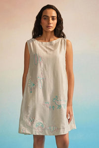 A flowing silhouette crafted in hand screenprinted striped Chanderi, this Pleated Dress is all about quiet detail and graceful movement. Appliquembroidery runs across the surface, and soft pleats along the side panels create an elegant shape. Finished with a back tieup, this dress is both structured and fluid a refined piece that feels as thoughtful as it looks.