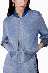 Featuring Front open short jacket ribbed and denim detailing paired with pants with gold button detailing