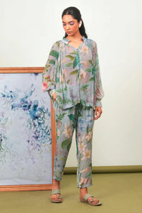 Featuring the Holly Chiffon Breeze Co-ord Set by Sage Saga's Valley of the Night collection. This elegant ensemble pairs a delicate chiffon top with tailored crepe trousers, creating a chic and comfortable look for day or evening wear.