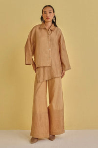 Featuring the Honey Gold Pintuck Asymmetrical Shirt Jacket With Palazzos by 29 India's Sunehri collection. Made from organic cotton, this set is adorned with intricate pintuck detailing by master craftsmen, blending refined design, sustainable fabric, and effortless elegance.