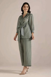Featuring the Honey Suckle Tie Co-ord Set in 100% linen, this relaxed-fit set includes a classic collared tie-up top adorned with hand-drawn florals, delicate organza appliqué, and detailed cotton and silk thread embroidery. Heat-pressed stippled circles enhance the luxurious linen fabric for a refined look.