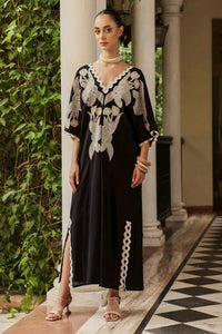 A boho-chic signature kaftan featuring honeycomb embroidery and scallop trim detailing on the neckline, sleeves, and bottom hem. This elegant piece blends comfort with artisanal craftsmanship, perfect for casual days or stylish lounge wear.