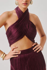 Featuring Hope Halter in Burgundy with Elastic Back by Aroka’s A/W 2025 Collection, this sculpted halter top is crafted in lustrous burgundy modal satin with delicate hand-ruching. Designed with a crossed halter neckline, cropped body-skimming fit, and elasticated back with neck tie-up for an adjustable, secure finish.