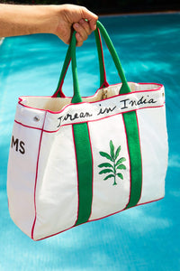 Storytelling with artisanal luxury, the ‘India Tote’ brings alive the wild Indian garden. In Poppy Red, slides a desire like snake, under the canopy of the frangipani bush, with koels crooning on Mughal vistas. It invites you to, well, dream in India. Be a quiet spectator to this hypnosis on pure cotton canvas in Indian Ivory. Inviting you into a trance.