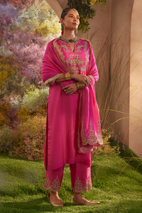 Step into elegance with this exquisite pure Silk Organza Kurta Set, resplendent in a stunning hot pink hue. Every inch of this ensemble is a testament to craftsmanship, meticulously hand-embroidered with dabka, Zari, pearls, sequences, and other intricate patterns that adorn not only the kameez but also the bottoms. The dupatta, an equally captivating piece, is embellished on both panels, showcasing a smart finish with Kiran lace that adds a touch of sophistication and completes the look with finesse.