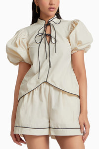 Featuring Hudson Oat Beige Shorts by Malie. These shorts have an elasticated waistband and contrasting black piping at the hem, crafted from sustainable cotton poplin, ensuring both comfort and environmental consciousness.