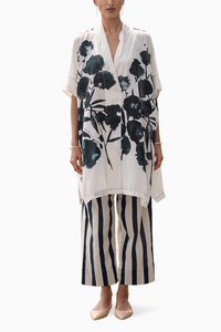 Featuring an off-white mul co-ord set. This anti-fit floral print tunic comes with shawl collar, side slits and hand running stitches at the hemline of the tunic and the sleeves. Comes with regualr blue striped trouser with front button opening and side pockets.