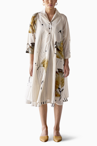 Featuring an off-white art print mul dress with lapel collars, front button opening, raglan sleeve and back pleat detailing. Comes with a black striped mul lining with lace detailing at the lining mul.
