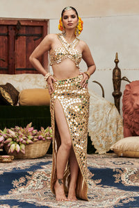 The mirror work skirt on gota lined with chanderi silk is adorned entirely with intricate mirror detailing featuring a stylish slit, and paired with criss-cross halter blouse.
