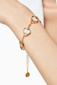 This stunning bracelet showcases a radiant Mother of Pearl, set on a hypoallergenic brass base for ultimate comfort. Enhanced with a 2K gold-plated glossy finish, it exudes a sophisticated shine, making it a perfect accessory for any elegant ensemble.