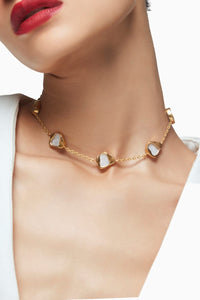This exquisite neckpiece features a luminous Mother of Pearl centerpiece, set against a hypoallergenic brass base. The piece is beautifully enhanced with a 2K gold-plated glossy finish, offering a luxurious and radiant touch. Perfect for adding elegance and sophistication to any outfit