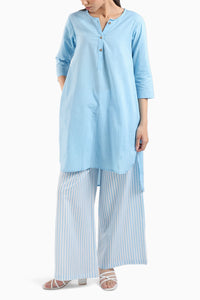 Cool, calm, and comfortable—this ice blue cotton kurta set is just right for daily wear. The plain kurta has a relaxed, easy fit and goes perfectly with soft striped cotton pants. Made from breathable fabric, this set keeps you fresh all day—whether you're at work, at home, or out and about.