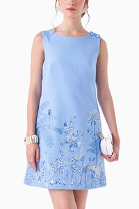 Featuring a Banana Crepe Savanna ice blue embroidered sleeveless dress in a flattering A-line silhouette. Detailed with jungle-inspired embroidery on the front and shoulder buttons, this dress combines effortless style with subtle, nature-inspired charm.