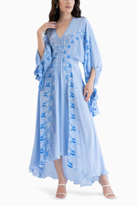 Featuring the Ice Fly Printed High Low Dress with Kaftan Sleeves by Mandira Wirk's Waves of Love Collection. This stunning blue crepe dress showcases a flattering plunging neckline and flowing kaftan sleeves with wrist ties, making it an elegant choice for any occasion.