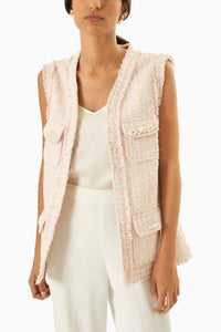 If you tend towards a more classic look, this shimmer sleeveless tweed jacket is an excellent investment that'll blend in a sophisticated wardrobe. The straight fit silhouette is cut from tweed and features sleeveless style, attached pockets, pearl detailing on the flaps. Wear this classy design with everything from jeans to formal pants to skirts.