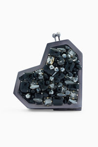 A geometric heart metal frame adorned with diamonds and stones of different shapes and sizes. Each piece is carefully embroidered on a striking black base, which adds to the bag’s sleek silhouette. When it’s something so iconic and sumptuous, *add to cart* comes easily. It’s the perfect piece to match your festive wardrobe, from twirl-style lehengas to form-fitting gowns.