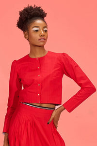 Featuring Iggy Red Top by Chilosophy's Queendom Collection, this short-length top offers slim-fit sleeves and statement embroidery at the back, adding elegance and personality to your outfit. With a metallic button closure, it’s perfect for special occasions or a fashionable night out.