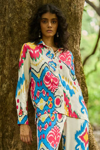 Relaxed-fit collared shirt featuring a multi colour large-scale Ikat print, wooden button closure, and full sleeves with buttoned cuffs. Made from breathable, textured organic viscose fabric.