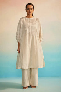 Designed for ease and elegance, the Iki Dolman Kurta features soft box pleats and panels, dolman sleeves, and subtle appliquembroidery. Paired with the fluid, Hama Akari Stripe Pants with detailed drawstring ends, this set offers a graceful silhouette perfect for everyday refinement.
