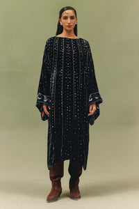 The Ila Poncho is crafted in textured velvet, offering a soft, elevated drape. Its relaxed, easy-to-layer silhouette ensures effortless styling, while hand-finished blanket-stitch detailing along the edges adds artisanal texture. Finished in the Shooting Stars print, it brings whimsical charm and refined seasonal appeal.