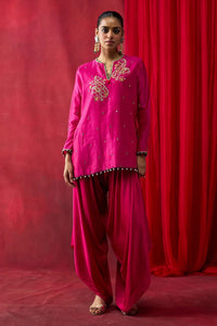 Featuring a pink silk Chanderi top adorned with thread and hand embroidery, finished with elegant pearl tassel details on the hem. Paired with sleek satin cowl pants, this ensemble blends intricate craftsmanship with modern sophistication.